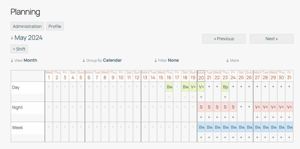 Doorschakelaar ondersteunt ook meer complexe schakelschema’s met dag- en nacht dienst waarbij de dagdienst zogezegd gaten schiet in de nachtdienst. Voor degene die nachtdienst heeft, hoeft maar één nachtdienst voor de hele week ingepland te worden. De overdag diensten komen er als het ware gewoon doorheen.